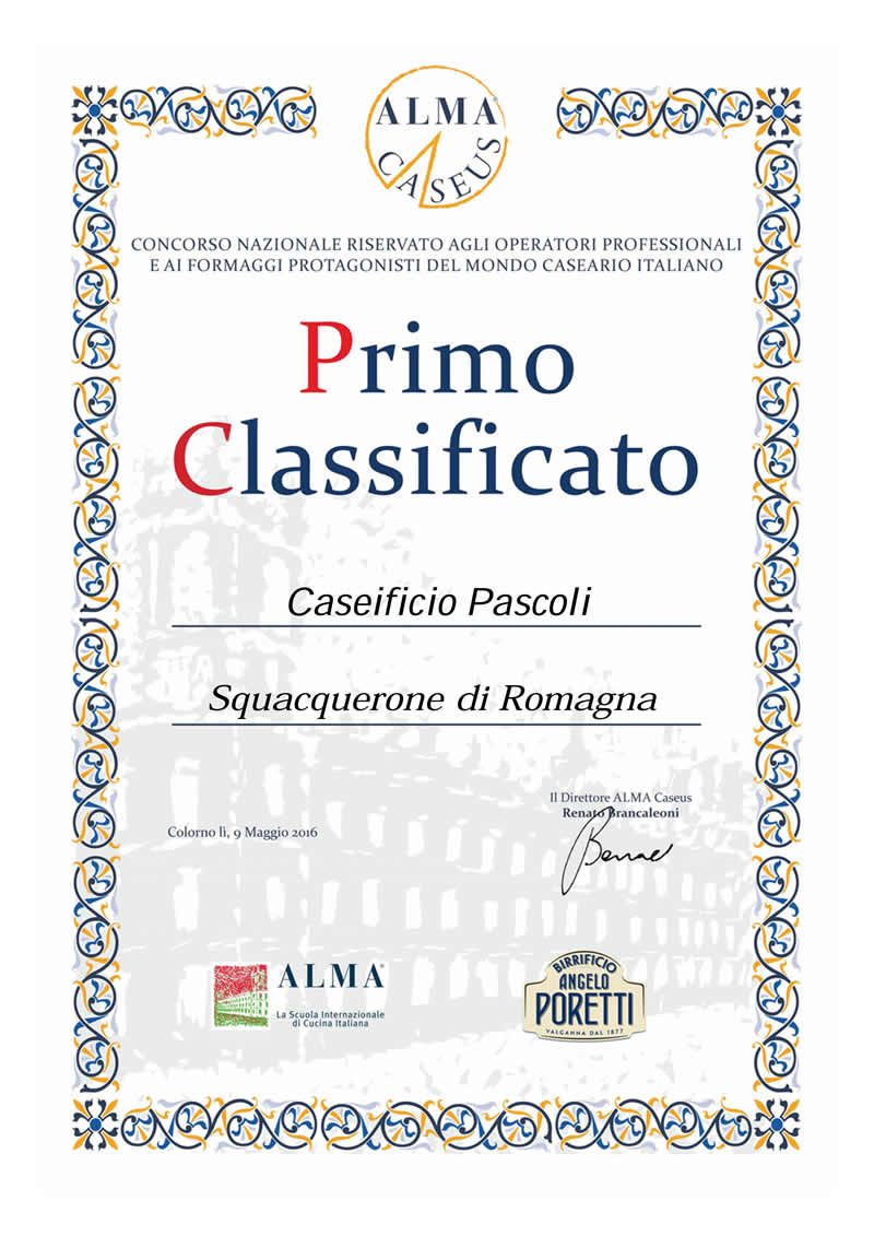 2016 – Concorso nazionale AlmaCaseus, Cibus, Parma; primi nella categoria formaggi freschi di latte vaccino-bufalino, medaglia d’ ORO per lo Squacquerone di Romagna DOP