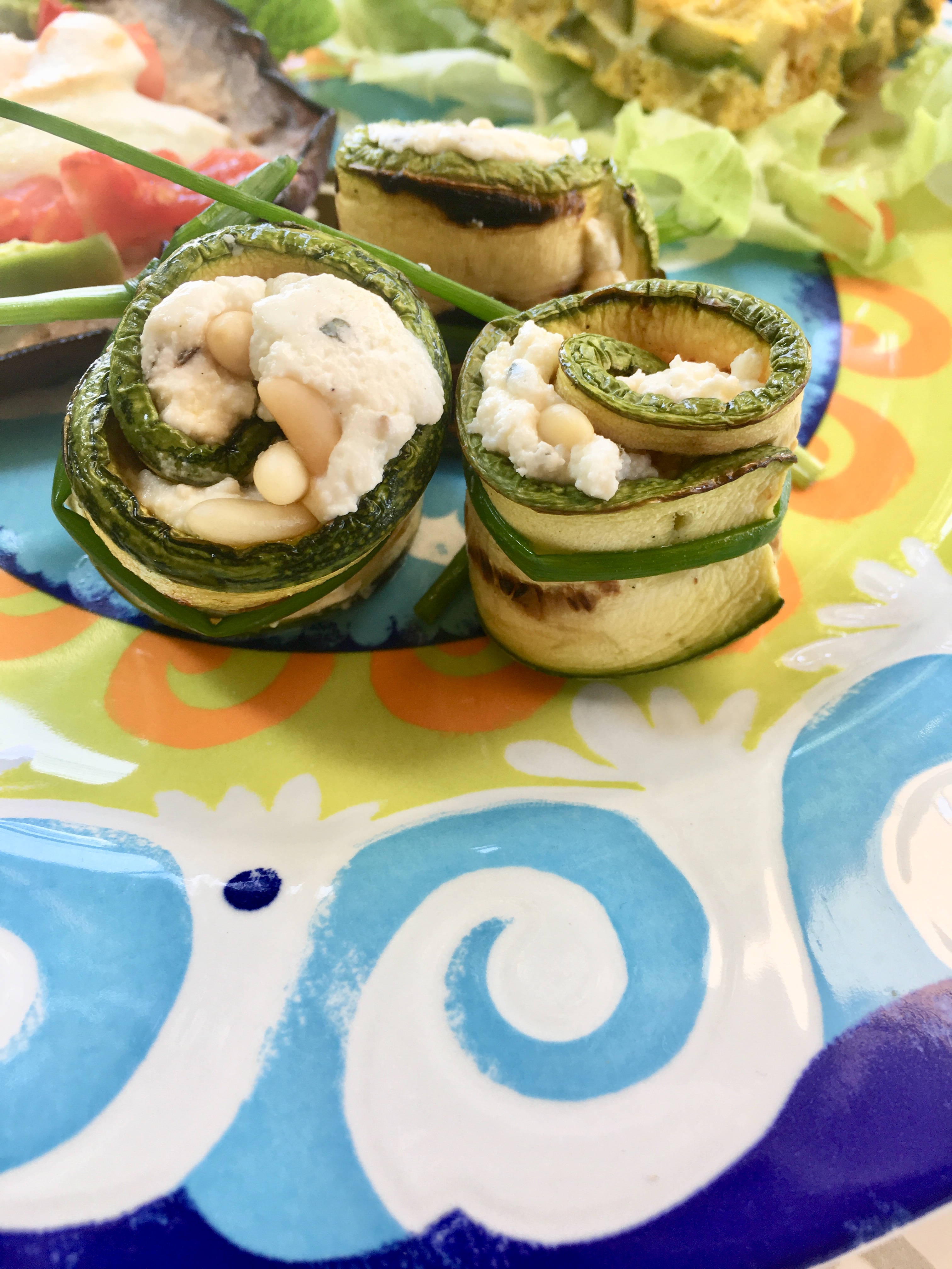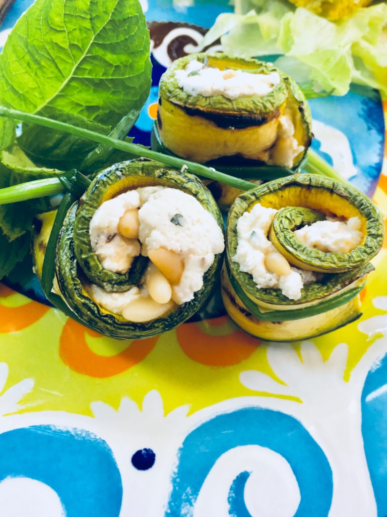 PREPARAZIONE: Mondate le zucchine e tagliatele a fette longitudinali dello spessore di circa 2 mm. Grigliate le zucchine su una piastra rovente, poi mettetele in un piatto a raffreddare. Prendete ora le fette di zucchina e spalmatele con il formaggio, poi ricoprite con un pizzico di sale, pepe, dei pinoli tostati e qualche fogliolina di menta. Arrotolate le fette per formare i rotolini, poi legate con dei fili di erba cipollina. Procedete in questo modo per tutte le fette di zucchine,poi disponetele in piedi uno a fianco dell’altro e servite
